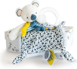 Questa splendida confezione regalo include il peluche Koala Yoca, che è il compagno ideale per il bambino sin dalla nascita. Fornisce un senso di sicurezza e comfort grazie al suo materiale morbido. Il sonaglio con perline all'interno dell'anello offre stimolazione e divertimento per i più piccoli.