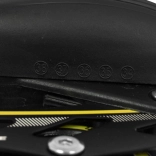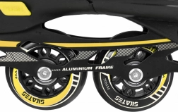 La scarpa è completata da una ventilazione efficace, membrana semi‑traspirante e soletta sagomata con morbida schiuma EVA rivestita in materiale vellutato Velvet. La chiusura tripla (allacciatura, strap in velcro, leva con blocco) mantiene il piede stabile. Il telaio in alluminio con ruote in PU 70×24 mm, durezza 85A e cuscinetti ABEC‑7 offre una guida fluida e veloce; il pattino destro è dotato di freno.