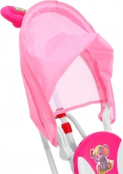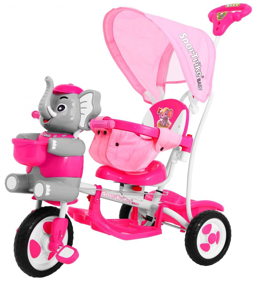 Le ampie ruote in morbida schiuma attutiscono silenziosamente e comodamente le irregolarità; la ruota anteriore con frizione facilita il controllo e il poggiapiedi rimovibile sostiene i bambini che non pedalano ancora. L’elefantino sulla parte anteriore nasconde un vano per piccoli oggetti e sul manubrio offre divertenti effetti sonori. Non mancano il cestello posteriore, il rivestimento del sedile e l’ampia cappottina parasole per pedalare con ogni tempo.