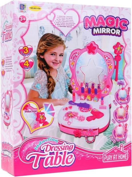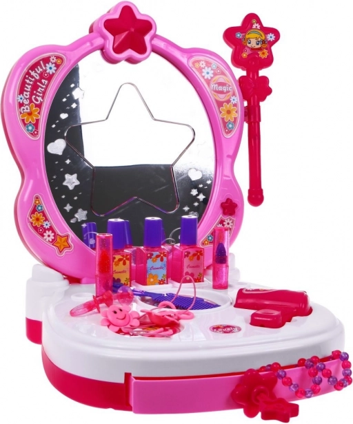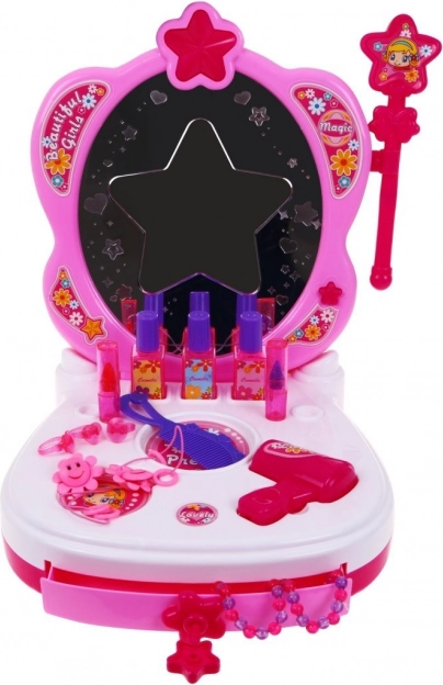 Deliziosa toeletta per bambine dai 3 anni che offre uno specchio stellato luminoso, accompagnamento musicale e un ricco set di accessori per un gioco creativo. Con una magica bacchetta rosa, phon, gioielli e “cosmetici” giocattolo, sviluppa fantasia e motricità fine. Alimentazione 3× AA (non incluse).