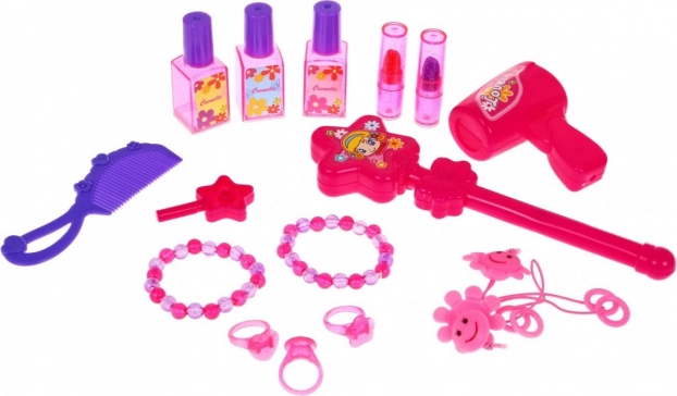 Include una bacchetta magica, phon, pettinino, chiavetta per il cassetto, flaconi profumo e rossetti finti, elastici, braccialetti e anellini.