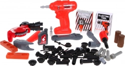 Contenuto della confezione (selezione da 78 pz): valigetta, postazione, trapano/cacciavite con accessori intercambiabili, sega, martello, cacciavite a croce, chiave a tubo e regolabile, elementi in legno, viti, dadi, adesivi e altri accessori.