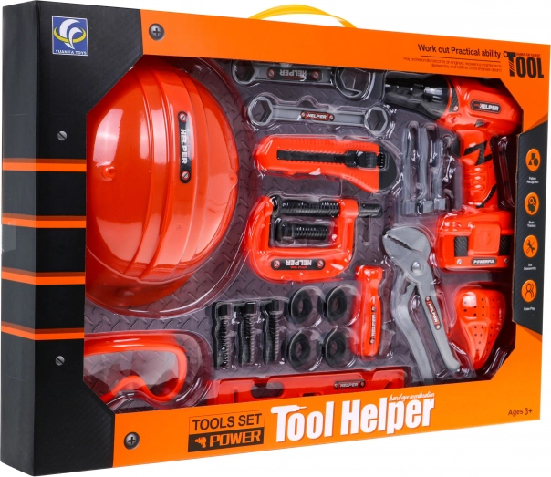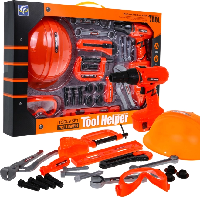 - avvitatore, casco con elastico, occhiali protettivi con elastico, livella, morsa a vite, taglierino a lama segmentata, chiave a forchetta/anello, chiave inglese, pinze regolabili, maschera da saldatura con elastico, chiave a bussola, 4× vite, 4× dado, punta, bit piatto e a croce.