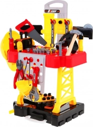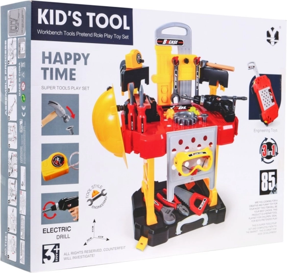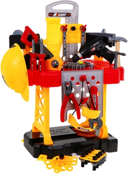 Dotazione ricchissima: avvitatore/trapano a batteria, martello, morsa, sega, pinze, chiavi a brugola e a forchetta, cacciaviti, viti, dadi, ingranaggi, metro e componenti di lavoro filettati per infinite attività di avvitatura e montaggio. Grazie all’organizzazione intelligente degli attrezzi, i bambini allenano ordine, pazienza e coordinazione mano-occhio.