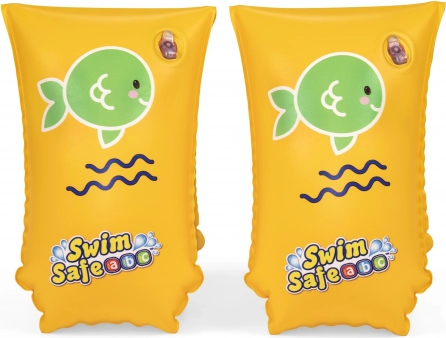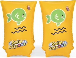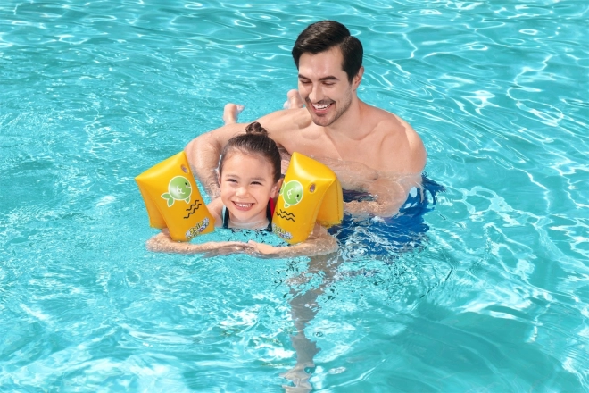 I braccioli giallo brillante con pesciolino verde sono ben visibili e motivano i bambini al gioco e all’apprendimento in acqua.