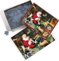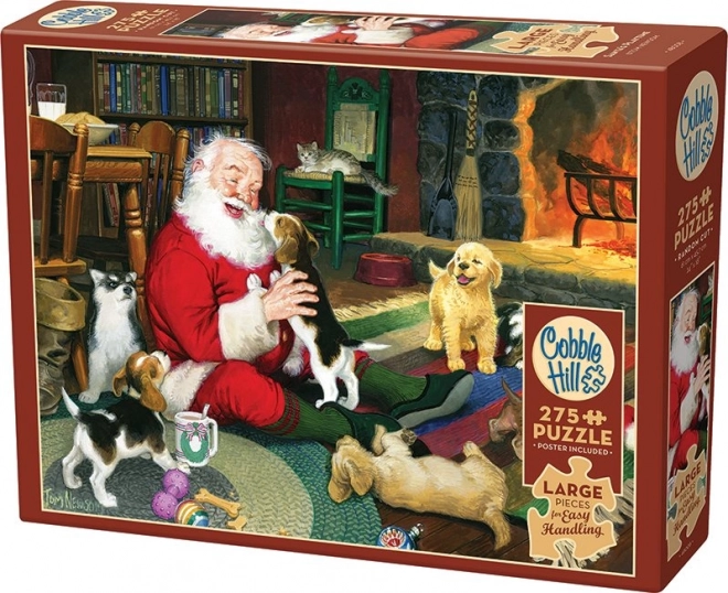 L’illustrazione di Babbo Natale al camino con gli amici animali crea un’atmosfera gioiosa e accogliente – il puzzle ideale per le serate invernali.