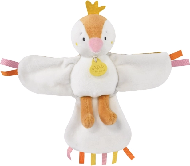 Questo soffice uccellino nelle tonalità del giallo e dell’arancione conquista con la sua delicatezza e la presenza sonora rilassante. I nastrini colorati su ali, coda e testolina invitano ad afferrare, mordicchiare e allenare la motricità fine. La scatola elegante con motivo floreale lo rende un bellissimo dono per i neo-genitori.