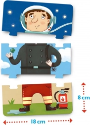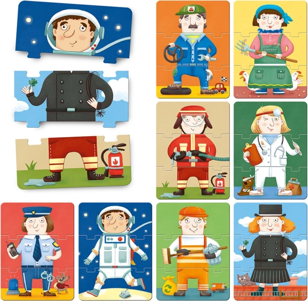 Crea combinazioni pazzesche di mestieri con il puzzle per bambini di Magellan! Tessere extra grandi e puzzle a tre parti mix & match facilitano la presa e il gioco, che sviluppa fantasia, concentrazione e coordinazione mano–occhio. Ideale per bambini dai 3 anni.