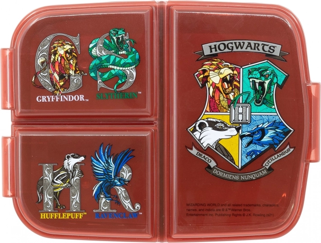 Pratico porta pranzo per bambini con tre scomparti con motivo HARRY POTTER mantiene il cibo separato e fresco. Realizzato in plastica resistente, entra perfettamente nello zaino scolastico e grazie alla chiusura sicura è ideale per i viaggi, la scuola e il parco giochi.