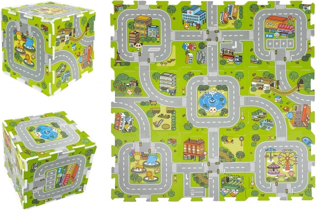 Il motivo con strade, parchi ed edifici stimola la fantasia e favorisce il gioco tematico con macchinine e personaggi.