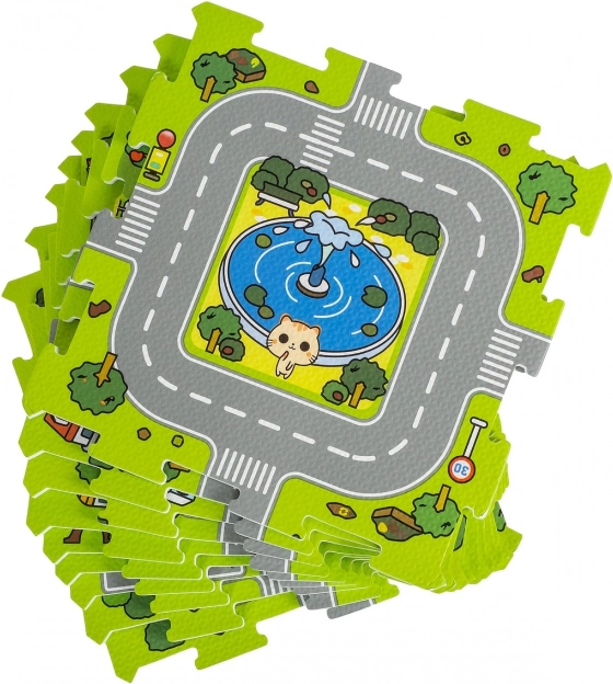Questo tappeto in gommapiuma versatile funge da comodo tappetino e da puzzle componibile con motivo di strade ed edifici. I bambini possono far viaggiare le macchinine in sicurezza, pianificare percorsi e allo stesso tempo esercitare la motricità fine e il pensiero logico. La stampa su un solo lato è chiara e accattivante, la superficie è piacevole al tatto e facile da pulire.