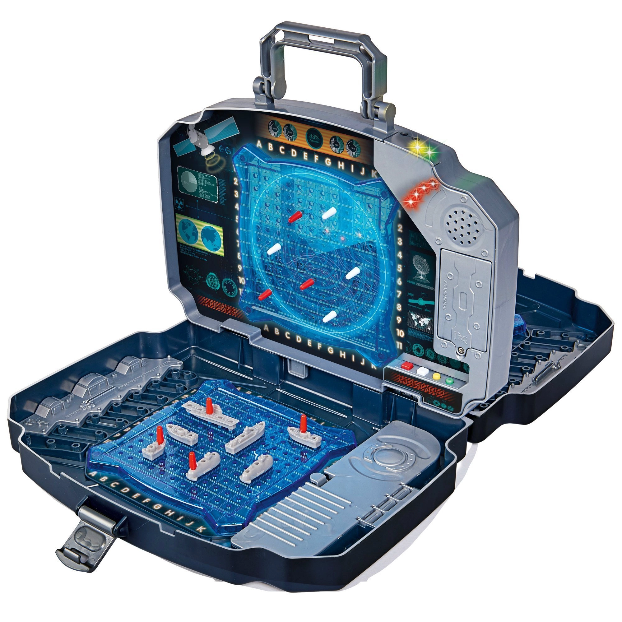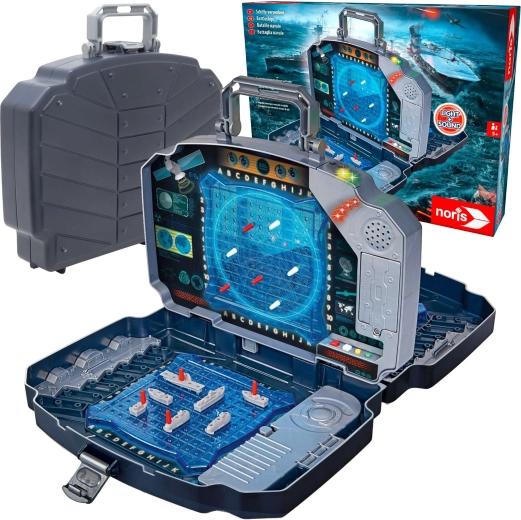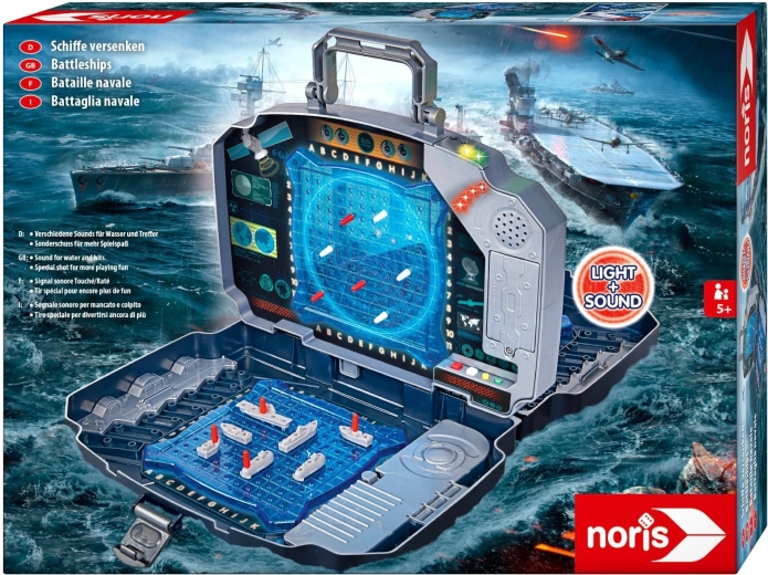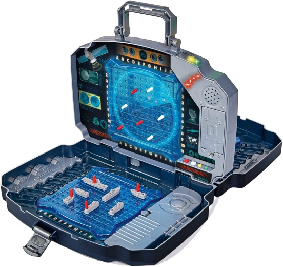 Gioco elettronico portatile Battaglia Navale in una robusta valigetta con doppia griglia di gioco blu, scomparti porta-accessori ed effetti di luce e suono. Per 2 giocatori, con facile tracciamento dei colpi grazie a piolini rossi e bianchi e comandi intuitivi per bambini dai 5 anni. Ideale a casa e in viaggio.
