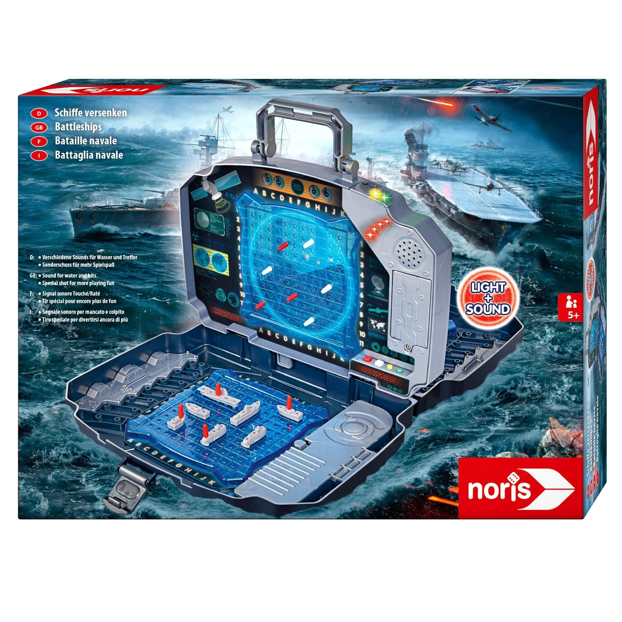 Goditi il classico della Battaglia Navale in una versione moderna. La solida valigetta color grafite ospita due griglie di gioco blu per posizionare le navi e un pannello centrale per segnare i colpi sull’avversario. Gli effetti luminosi e sonori integrati segnalano chiaramente colpo a segno o mancato: la partita è così chiara, avvincente e divertente per tutta la famiglia.