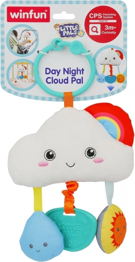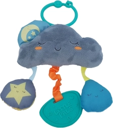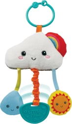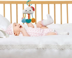 La nuvoletta sospesa Giorno e Notte è un morbido giocattolo sensoriale che stimola tatto, udito e vista. Texture colorate, parti fruscianti e sonagli e delicate vibrazioni dopo aver tirato l’asola mantengono viva l’attenzione del bebè e sostengono la sua naturale curiosità. Il motivo double-face – nuvoletta allegra di giorno e volto sereno di notte – aiuta a creare una routine rilassante durante il giorno e prima della nanna.