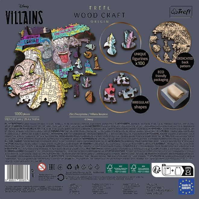 Scoprite i puzzle in legno premium e bifacciali TREFL della linea Wood Craft Origin con il motivo Disney: Incontro dei cattivi. Grazie alla lavorazione laser di alta precisione, i pezzi si incastrano perfettamente, i bordi sono lisci e il puzzle offre un esperienza unica per gli amanti dei puzzle e del mondo Disney. Vi aspettano 100 pezzi dalle forme uniche, stampa su entrambi i lati e confezione ecologica senza plastica.