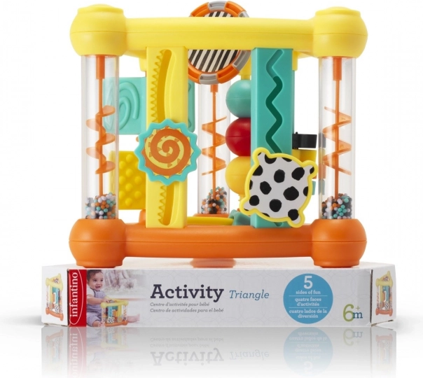 Centro di gioco attivo a forma di triangolo con molti elementi: forme diverse, perline, pulsanti. Adatto per giocare sia in casa che all’aperto. La forma triangolare del giocattolo permette di portarlo e trasportarlo facilmente. Su ogni lato c’è un divertimento diverso.