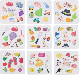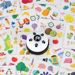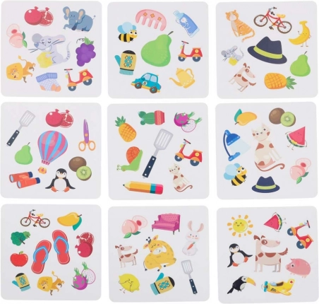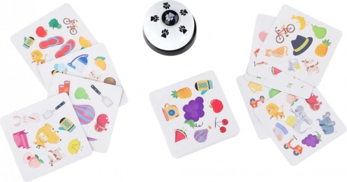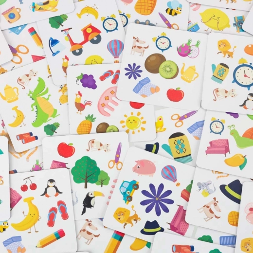- Come si gioca (esempio): Ogni giocatore prende una carta, il mazzo si posiziona sul tavolo. Girate la carta superiore del mazzo e cercate l’immagine in comune con la vostra. Chi la trova per primo suona e prende la carta sulla propria pila. Si continua fino a esaurire il mazzo.
