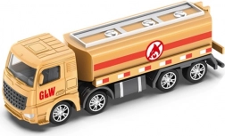 Camion cisterna beige con serbatoio cilindrico, strisce rosse e logo, offre un movimento fluido grazie alle ruote libere. Ideale per giochi di trasporto liquidi e per ampliare il “mondo del traffico” dei bambini.