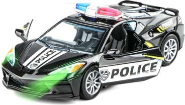 Goditi inseguimenti ricchi d’azione e uscite di servizio con un modello di auto della polizia in metallo curato nei dettagli. La robusta struttura in metallo garantisce una lunga durata, mentre le porte apribili e l’effetto luminoso rendono il gioco ancora più autentico.