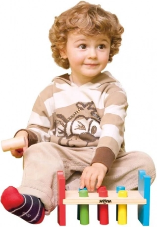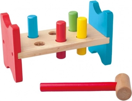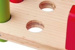 Martellare i pioli con il martelletto rafforza la motricità fine, la coordinazione occhio–mano e la precisione dei movimenti nei bambini più piccoli.
