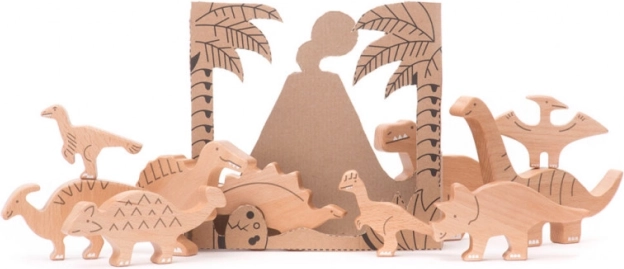 Il confezionamento del set è progettato per fungere da sfondo per giochi creativi. Tagliando lungo le linee predefinite del cartone si crea una scena preistorica. I giocattoli sono realizzati in legno di faggio, noto per la sua durata e compatibilità ambientale. Gioco e apprendimento vanno di pari passo attraverso materiali naturali.