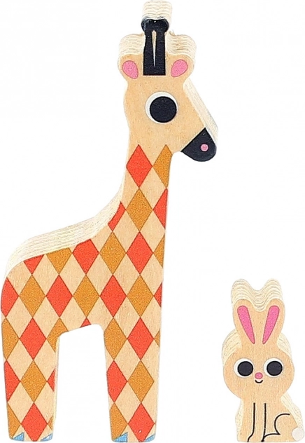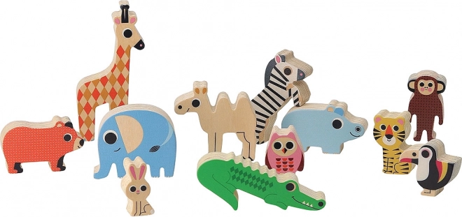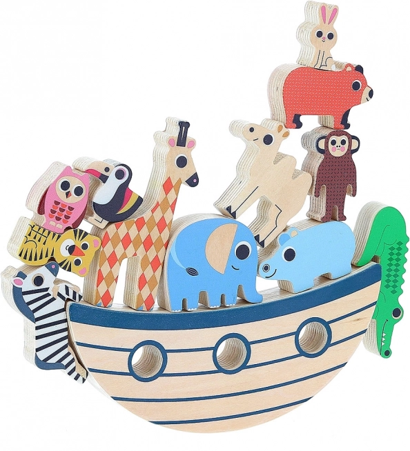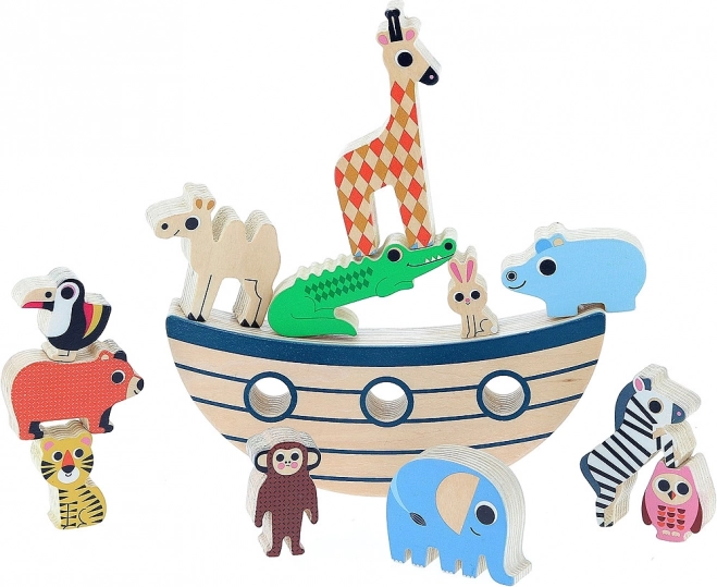 Il gioco contiene una vasta collezione di 12 animali di legno che i bambini possono impilare ed equilibrare sulla base.