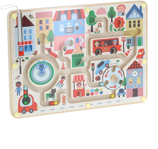 Entra in un mondo pieno di colori e fantasia con il gioco Labirinto magnetico La mia città. Usa la penna magnetica per guidare le biglie colorate attraverso la città e sviluppare così la motricità fine del tuo bambino. Un giocattolo in legno che non è solo uno strumento per l'apprendimento giocoso, ma aiuta anche ad espandere il vocabolario del bambino.