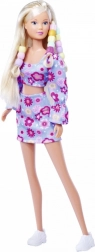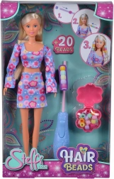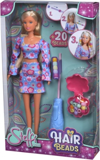 Bambola Steffi con outfit floreale a due pezzi, con uncinetto per infilare perline in una ciocca di capelli, perline colorate, elastico per il fissaggio e pettine con vano portaoggetti. Altezza della bambola 29 cm.