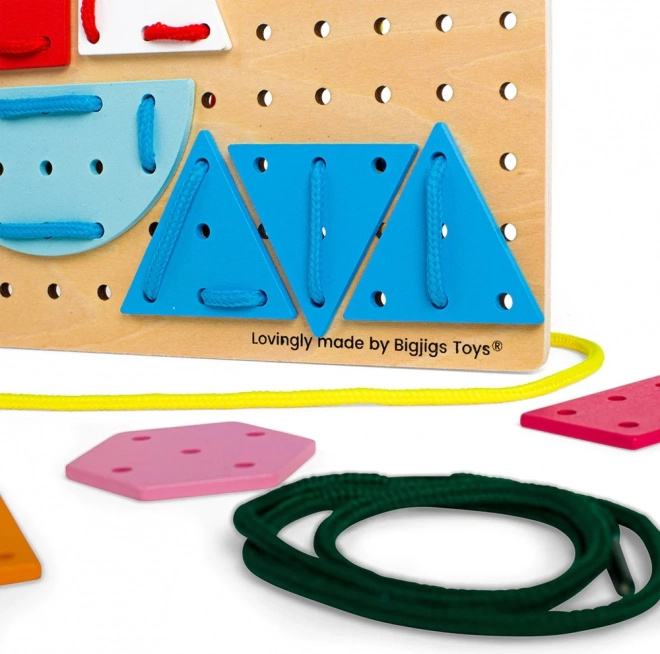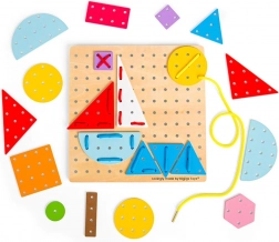 Infilare i lacci attraverso i fori della base e dei pezzi rafforza le dita, allena la coordinazione occhio–mano e migliora la concentrazione. Attività ideale per i bambini in età prescolare.