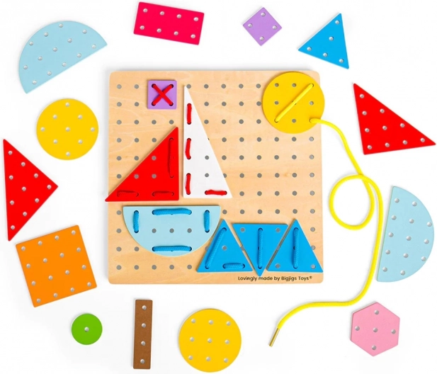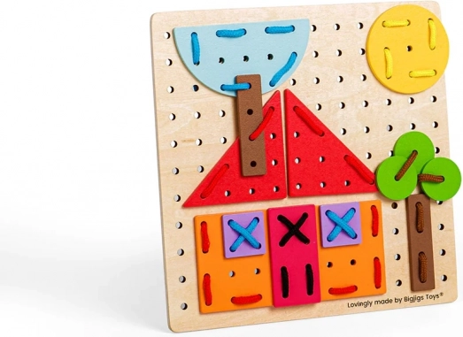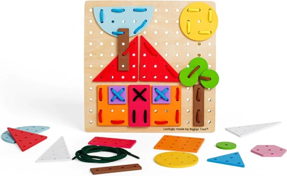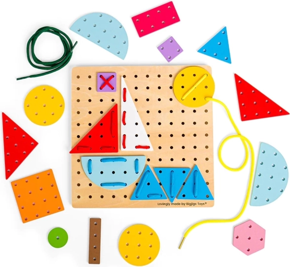 Nella confezione trovi una robusta base in legno, 44 forme colorate e 6 lacci resistenti per l’infilatura. Il giocattolo è realizzato con materiali provenienti da fonti responsabili e rispetta tutte le norme di sicurezza europee, così puoi contare su un gioco sicuro già dai 3 anni.