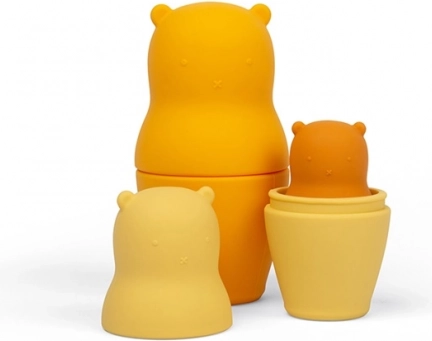 Il set di tre orsetti in tre dimensioni può essere inserito uno nell’altro come una matrioska, risparmiando spazio e allo stesso tempo sviluppando motricità fine, coordinazione mano-occhio e percezione dei colori. Il materiale morbido e sicuro è piacevole al tatto e in bocca, quindi è perfetto come massaggiagengive durante la dentizione.