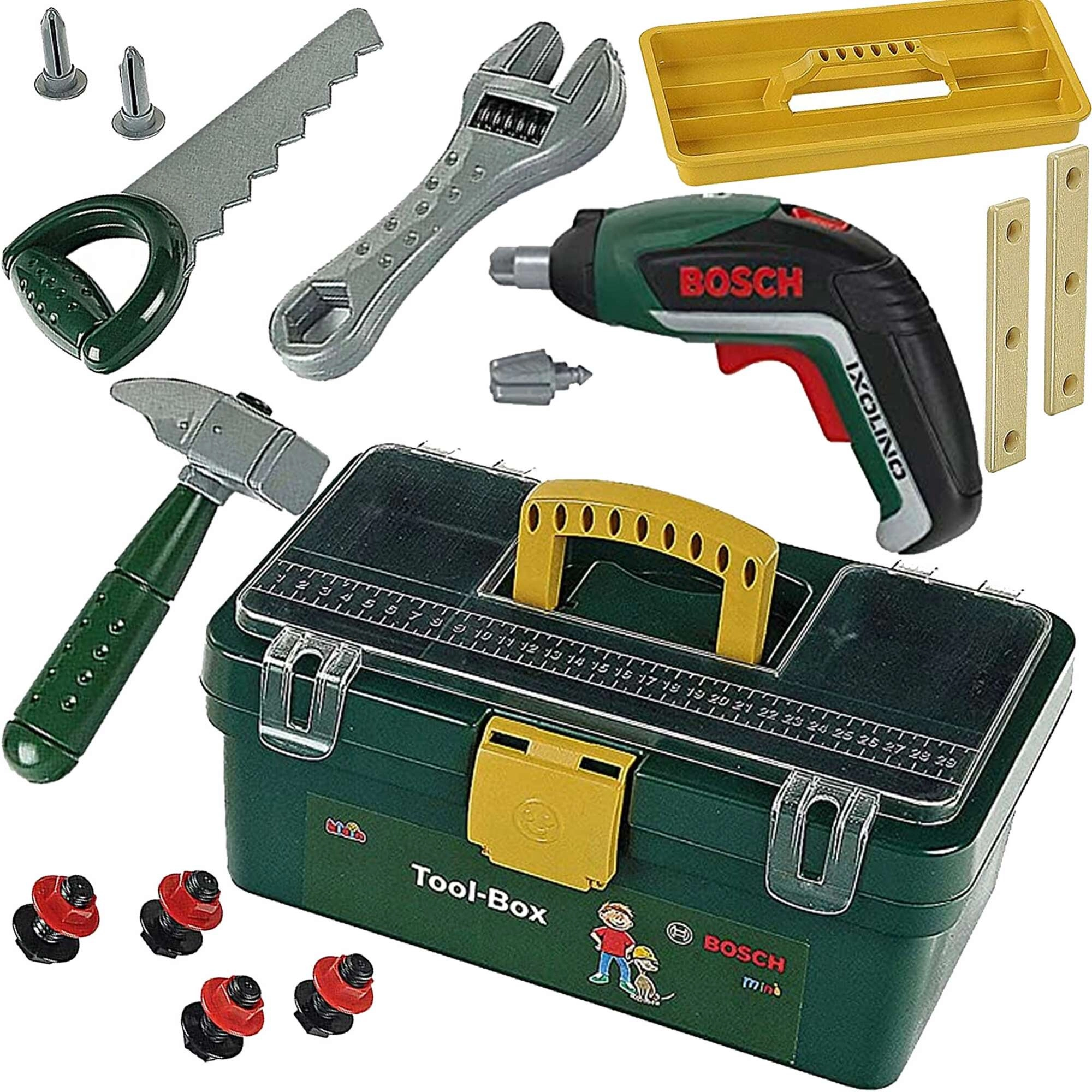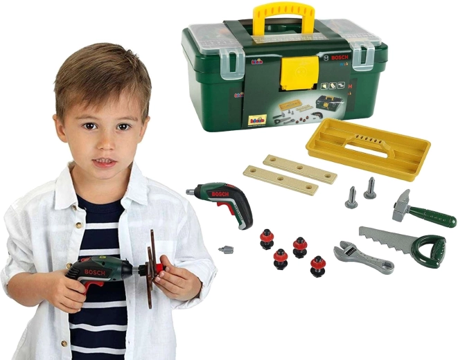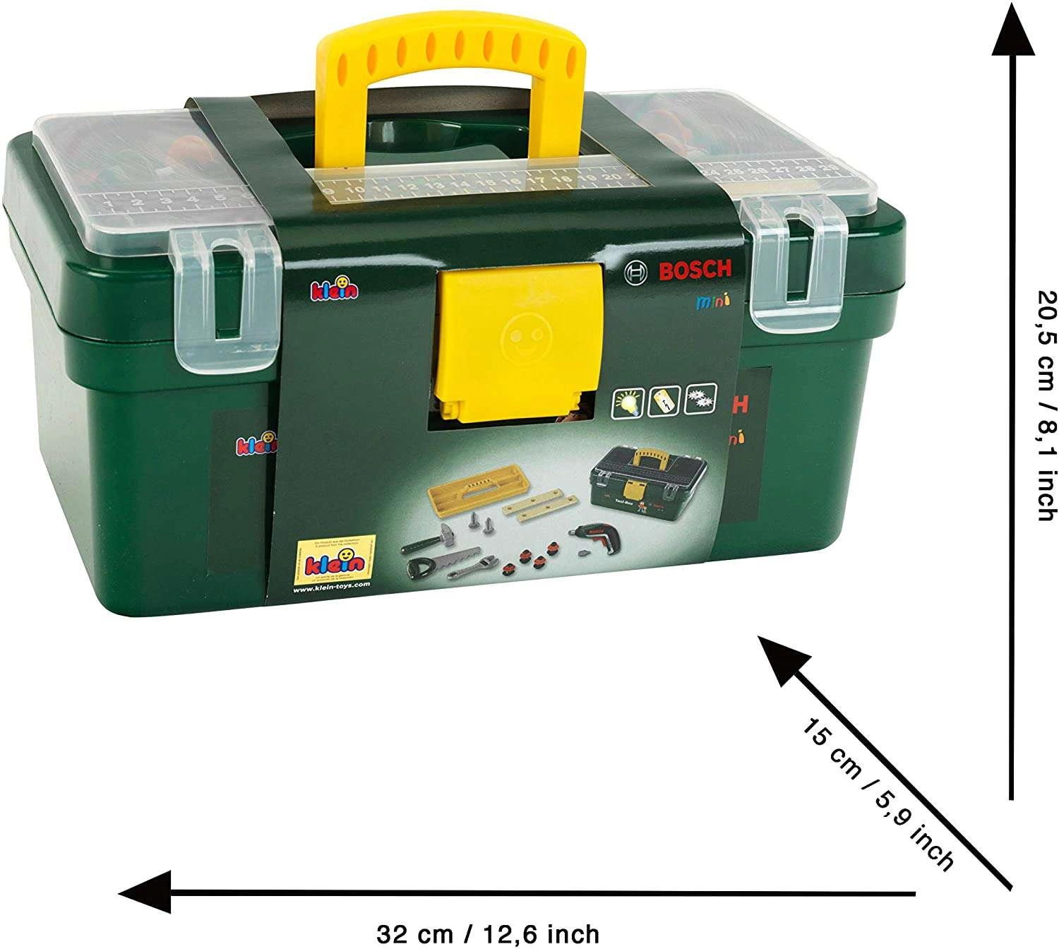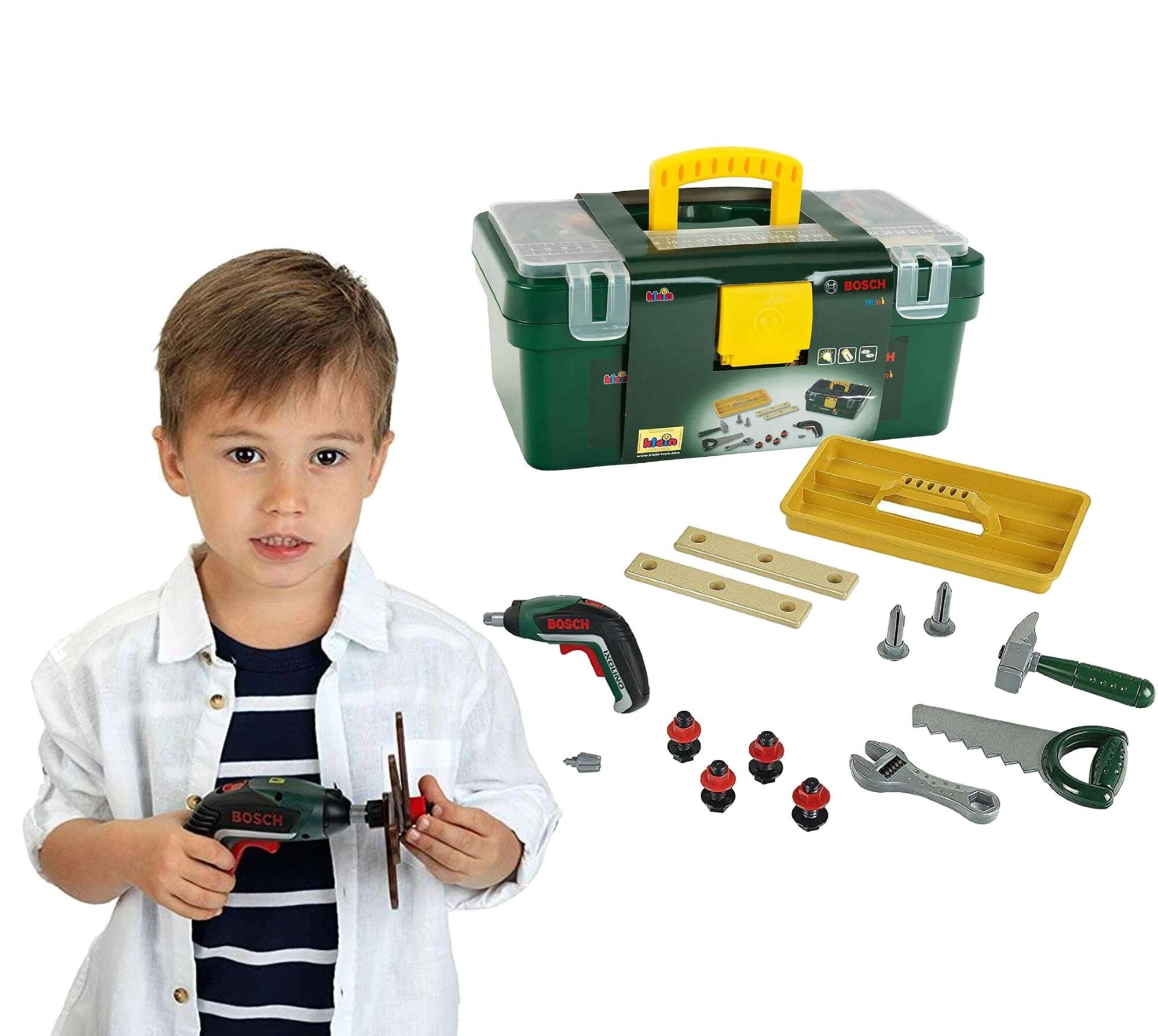 Valigetta per bambini con attrezzi del marchio KLEIN nel design con licenza BOSCH che offre un gioco da riparatore sicuro e divertente. La pratica valigetta verde scuro con manico giallo e coperchio trasparente racchiude un ricco set di strumenti, inclusa la trapano avvitatore senza fili IXOLINO II con rotazione a sinistra/destra, sega, martello, chiave inglese, viti e piastrine da costruzione. Un’ottima scelta per sviluppare motricità, creatività e gioco di ruolo nei bambini dai 3 anni in su.