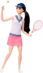 Bambola Barbie Carriera Tennista ha un totale di 22 articolazioni, permettendo ai bambini di entrare nelle loro fantasie sportive sfrenate. Indossa un outfit sportivo composto da un top bianco con accenti blu e una gonna rosa, completata da un berretto da tennis.