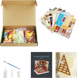Trovi tutto il necessario nella confezione – dai pezzi pretagliati in compensato agli elementi in carta e tessuto fino a colla, colori e pennello. Il montaggio prevede pittura e incollaggio, lavoro con piccoli dettagli e paziente assemblaggio, rendendolo un progetto ideale per un weekend tranquillo.