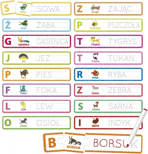 Il gioco stimola nel bambino il desiderio di scoprire le lettere giocando, associando l’immagine alla prima lettera del nome dell’oggetto. Inoltre, con un pennarello cancellabile il bambino può esercitarsi a scrivere, unire la linea tratteggiata e formare parole. In questo modo sviluppa le proprie abilità manuali e impara a scrivere.