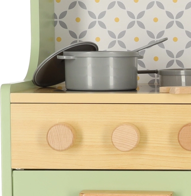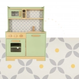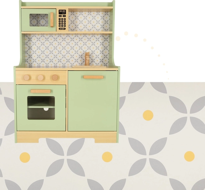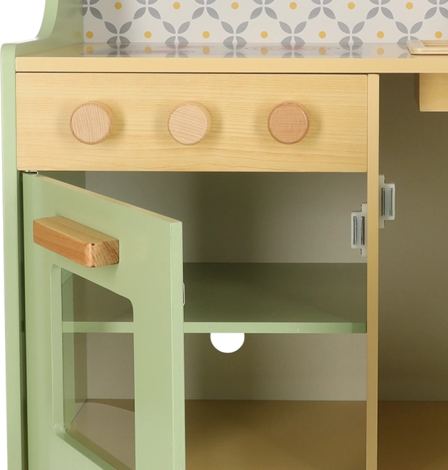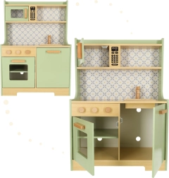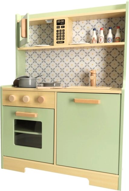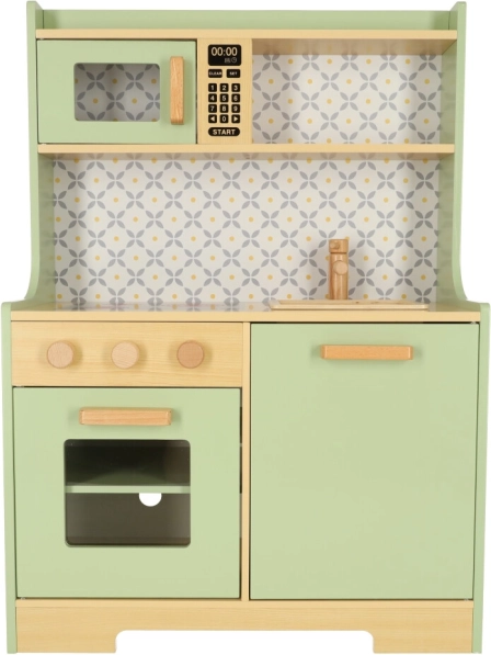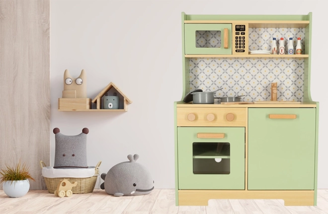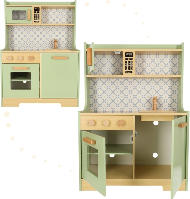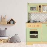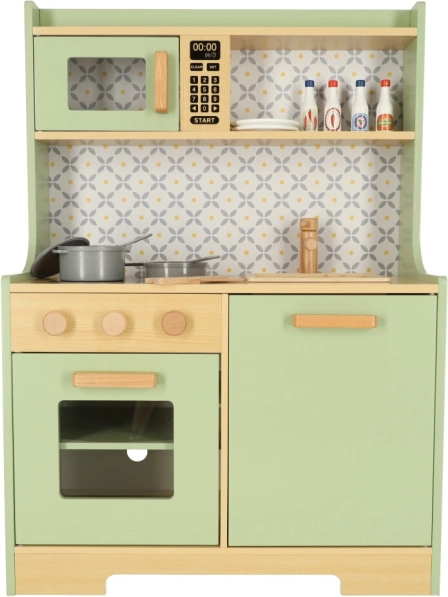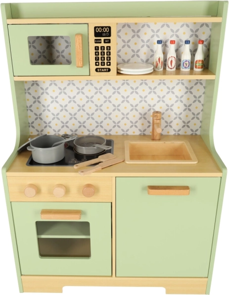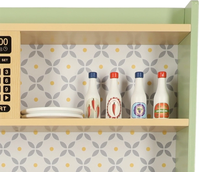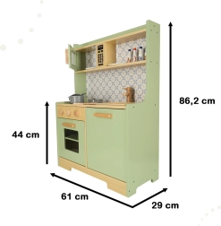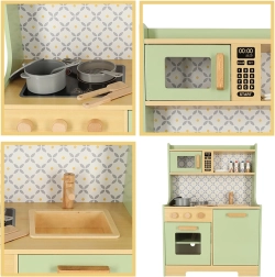 Permetti ai bambini di imitare i genitori in un ambiente sicuro con la cucina in legno verde menta. Comprende tutti gli elementi essenziali come forno, forno a microonde, piano cottura mobile e lavello, che emettono suoni realistici per rendere la simulazione di cucina il più autentica possibile.