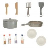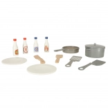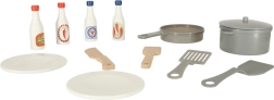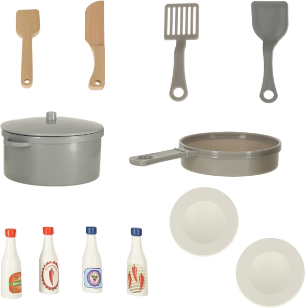 Il set include una ricca gamma di accessori tra cui una padella di plastica, una pentola con coperchio, utensili e piatti di legno. Non mancano quattro diversi tipi di salse per impreziosire i piatti.
