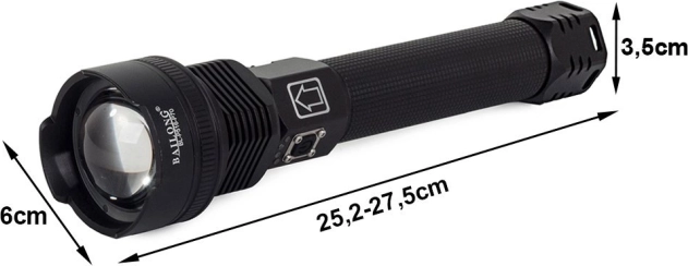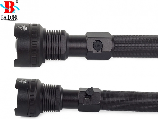 Potente torcia tattica BAILONG con LED CREE XHP70 per un'illuminazione affidabile all'aperto e in casa. Offre portata fino a 1000 m, zoom continuo, 3 modalità luminose, corpo robusto in alluminio aeronautico con protezione IPX5, ricarica USB, alimentazione 2× 26650 e indicatore LED dello stato di carica.