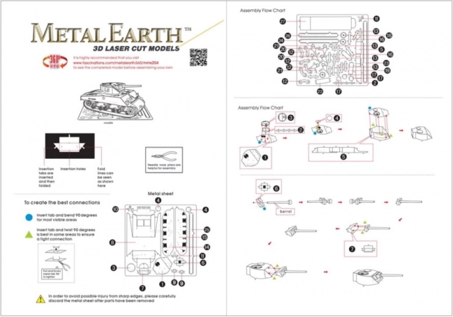 Rimuovi i singoli pezzi dai fogli metallici; se necessario, utilizza una piccola tronchesina (non inclusa). I pezzi si collegano tramite linguette e fori. Piega la linguetta con una piccola pinza a becchi sottili (non inclusa) e collega progressivamente tutte le chiusure fino a ottenere un pezzo magistrale dall’aspetto molto realistico!