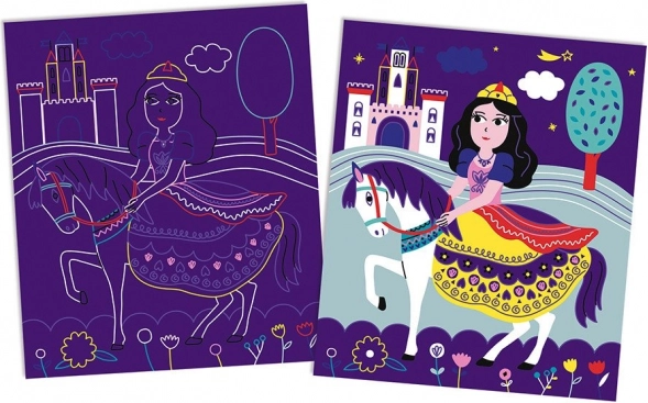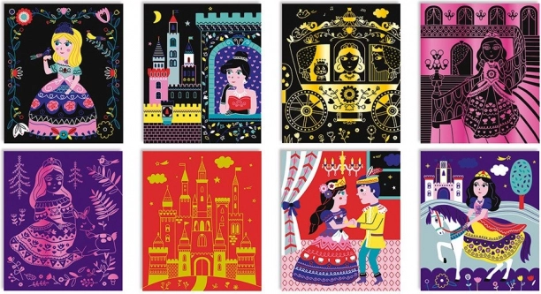 Il set include otto carte pre-disegnate con principesse, castelli e scenari magici. Ogni motivo ispira i bambini a creare e raccontare le proprie storie.