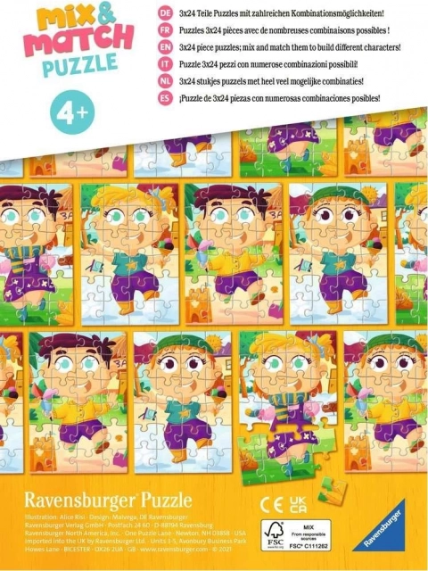 Scopri il divertimento dell’edizione Mix & Match, dove la fantasia non ha limiti. In un’unica scatola trovi tre puzzle di alta qualità da 24 pezzi, che puoi comporre in modo tradizionale seguendo le immagini oppure mischiare liberamente per creare nuovi e simpatici personaggi con abiti colorati.
