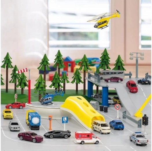 Il design intelligente del lato inferiore include il connettore standard SIKU WORLD per un facile collegamento con altri elementi del sistema. La strada di accesso è dimensionata per veicoli 1:50; se è necessaria una maggiore altezza di passaggio, è possibile rimuovere il tetto dell’ingresso per consentire il transito anche a modelli più grandi come taxi o ambulanze. Nella confezione trovi anche l’elicottero HELI TAXI in scala 1:87 per giocare subito.