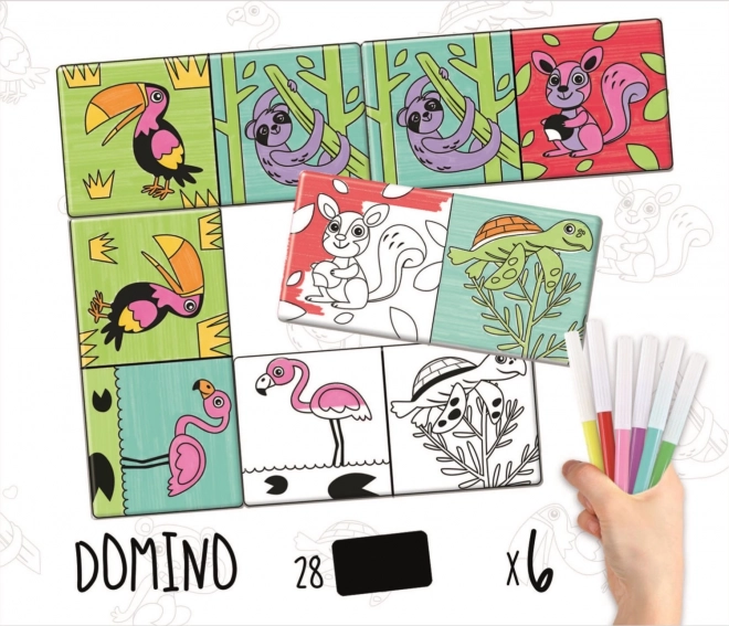 Divertente gioco domino per bambini con immagini di animali in bianco e nero, che possono colorare secondo la loro fantasia con i pennarelli inclusi. Allena l'osservazione e la memoria con un grande gioco che entusiasmerà ogni bambino.