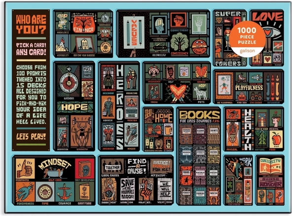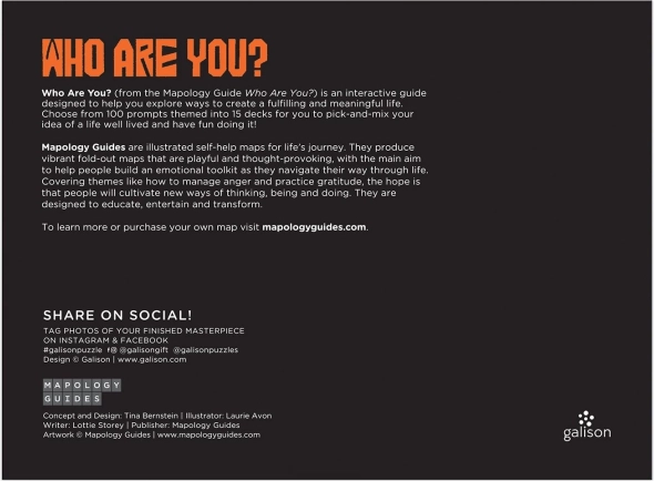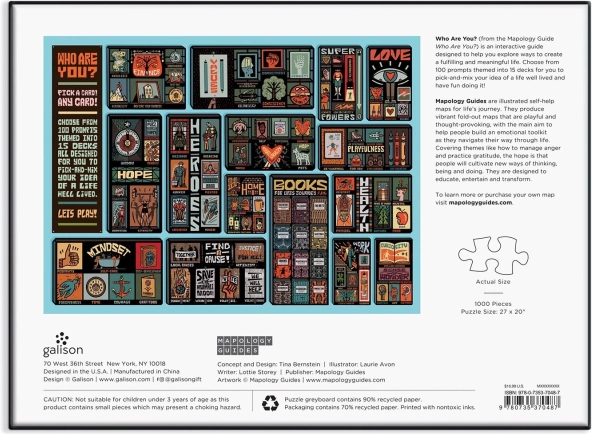 Immergetevi in un momento creativo di relax con un puzzle di design che trasforma il semplice assemblaggio in un esperienza significativa. Il soggetto “Who Are You?” è composto da una griglia ispirazionale di illustrazioni e citazioni di Mapology Guides – vi guida con delicatezza alla riflessione, all’auto-scoperta e a un atteggiamento positivo.