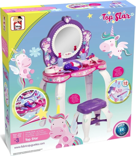 Trasformate la cameretta in un piccolo studio di bellezza. Il tavolino da toeletta CHICOS Top Star con motivo di unicorni entusiasmerà le piccole proprietarie con i suoi colori vivaci e accessori pratici. Inclusi uno sgabello e un set di 12 accessori, come boccette, phon, cerchietto e mollette, che stimolano il gioco fantasioso.