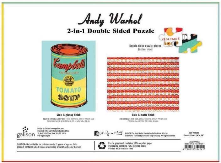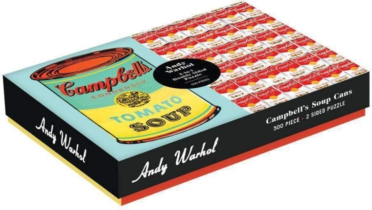 Goditi l’iconica opera pop art con questo puzzle double-face da 500 pezzi. Su un lato trovi il motivo di Campbell's Soup di ANDY WARHOL, sull’altro un pattern ripetuto. La doppia finitura – opaca e lucida – facilita l’ordinamento e l’assemblaggio. Idea regalo perfetta per gli amanti dell’arte e dei puzzle di qualità.