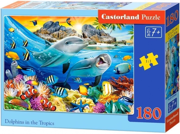 Colorato puzzle per bambini con il motivo dei delfini in un paradiso tropicale farà felici i piccoli amanti dei rompicapi. Il set contiene 180 pezzi e, una volta composto, crea un immagine di 32 × 23 cm. La stampa di qualità e i colori vivaci favoriscono il piacere dell’assemblaggio e lo sviluppo della fantasia dei bambini.