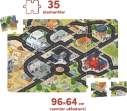 Scopri la vivace cittadina e i suoi abitanti con il grande puzzle da pavimento. Prepara le macchinine giocattolo e parti sulle strade! Pianifica il tuo percorso e visita i luoghi preferiti. Illustrazioni piene di humour e dettagli ispirano il gioco creativo. Invita fratelli e amici e godetevi momenti insieme!