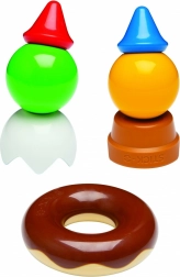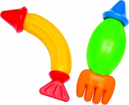Pezzi colorati, personaggini e strumenti sostengono la fantasia, lo sviluppo della presa e la coordinazione occhio–mano in ogni gioco.