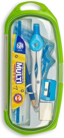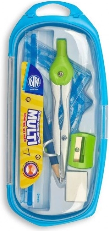 Dotazione scolastica completa per un disegno preciso in una pratica custodia. Questo set geometrico da 8 pezzi di ASTRA contiene tutto ciò di cui gli studenti hanno bisogno per matematica e disegno tecnico: compasso in metallo, righello, triangoli, goniometro, matita, temperino e gomma.